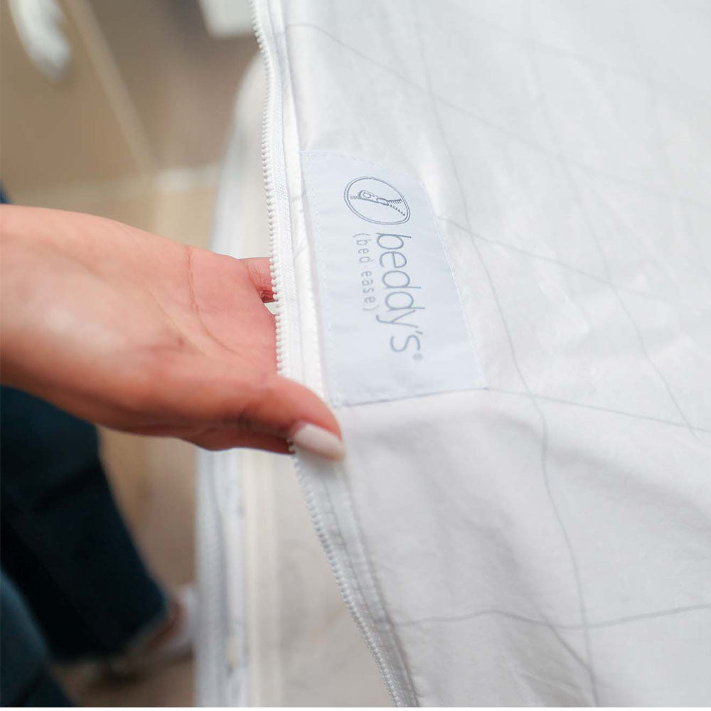 In addition to a zip-on comforter, our Beddy's sets also feature new zip-in fitted sheets. When you're ready to wash your sheets, simply zip off the comforter, the top sheet, and the fitted sheet, leaving the elastic band in place around the mattress.