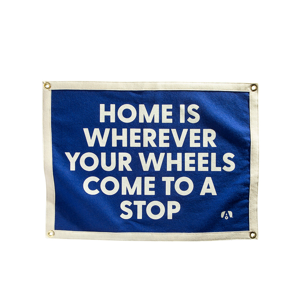 Airstreamers know that home is a state of mind that follows you wherever you go – especially with your shiny silver travel trailer in tow. Hang this hand-crafted flag wherever you need a reminder that "Home Is Wherever Your Wheels Come to a Stop."