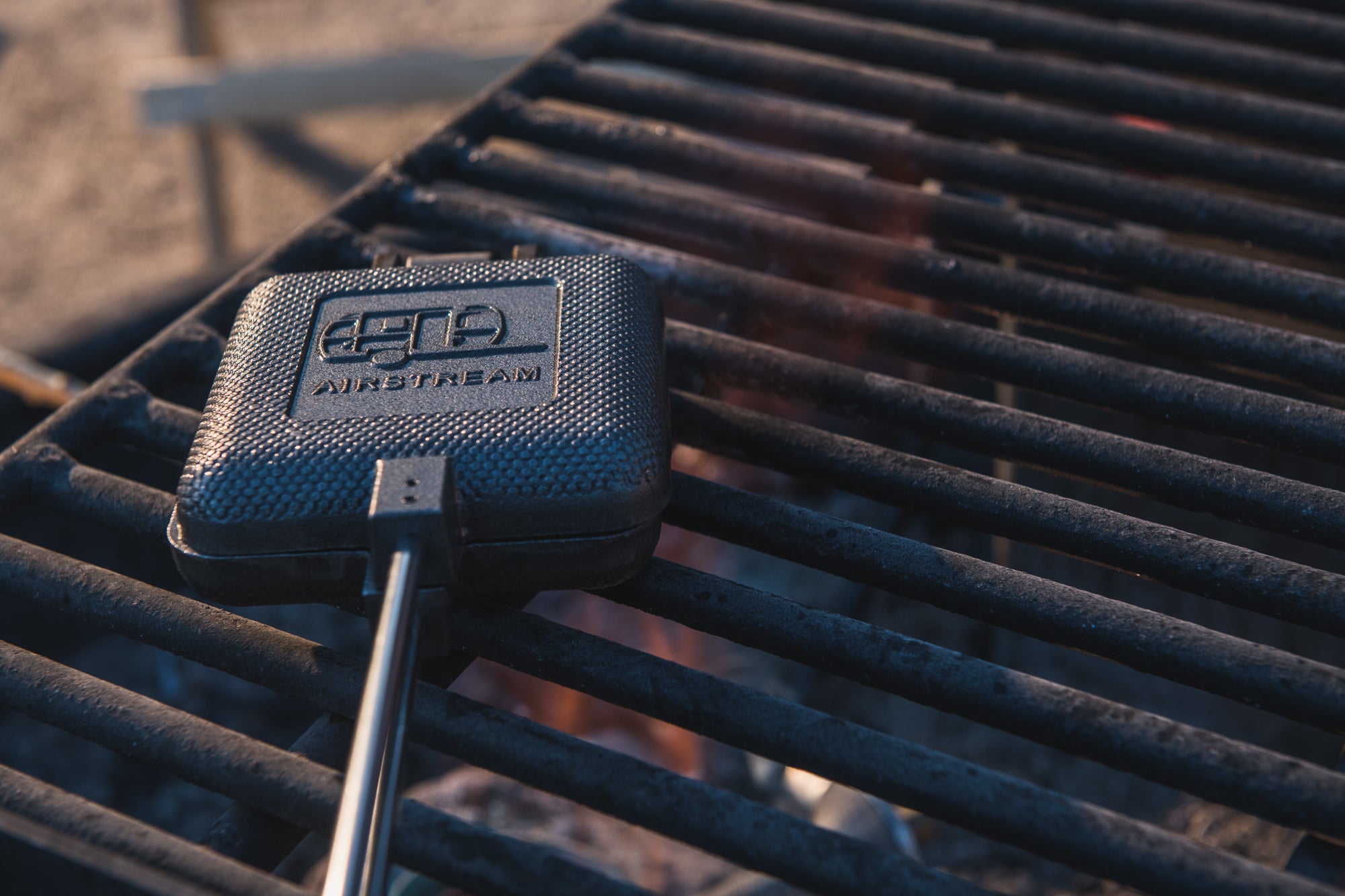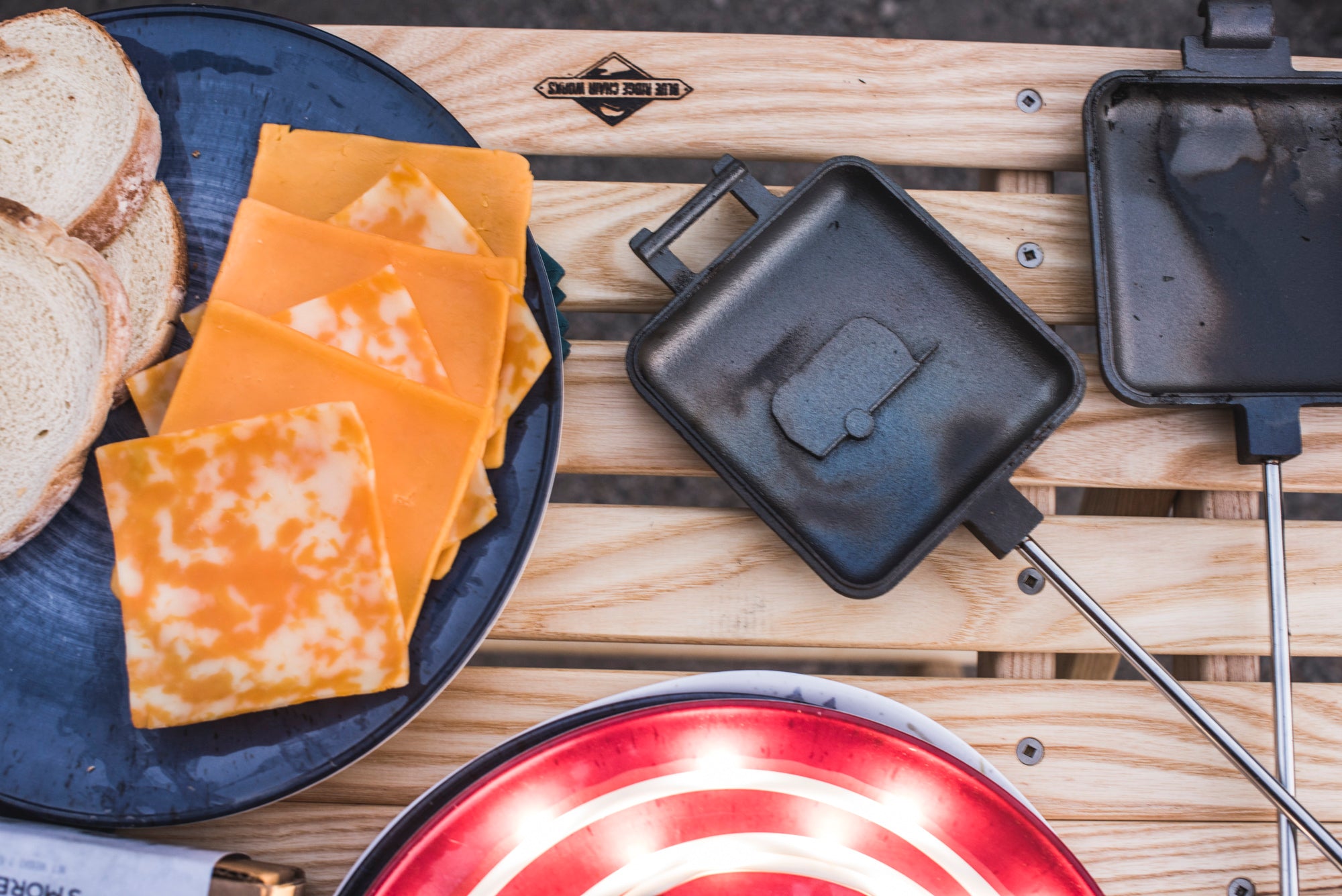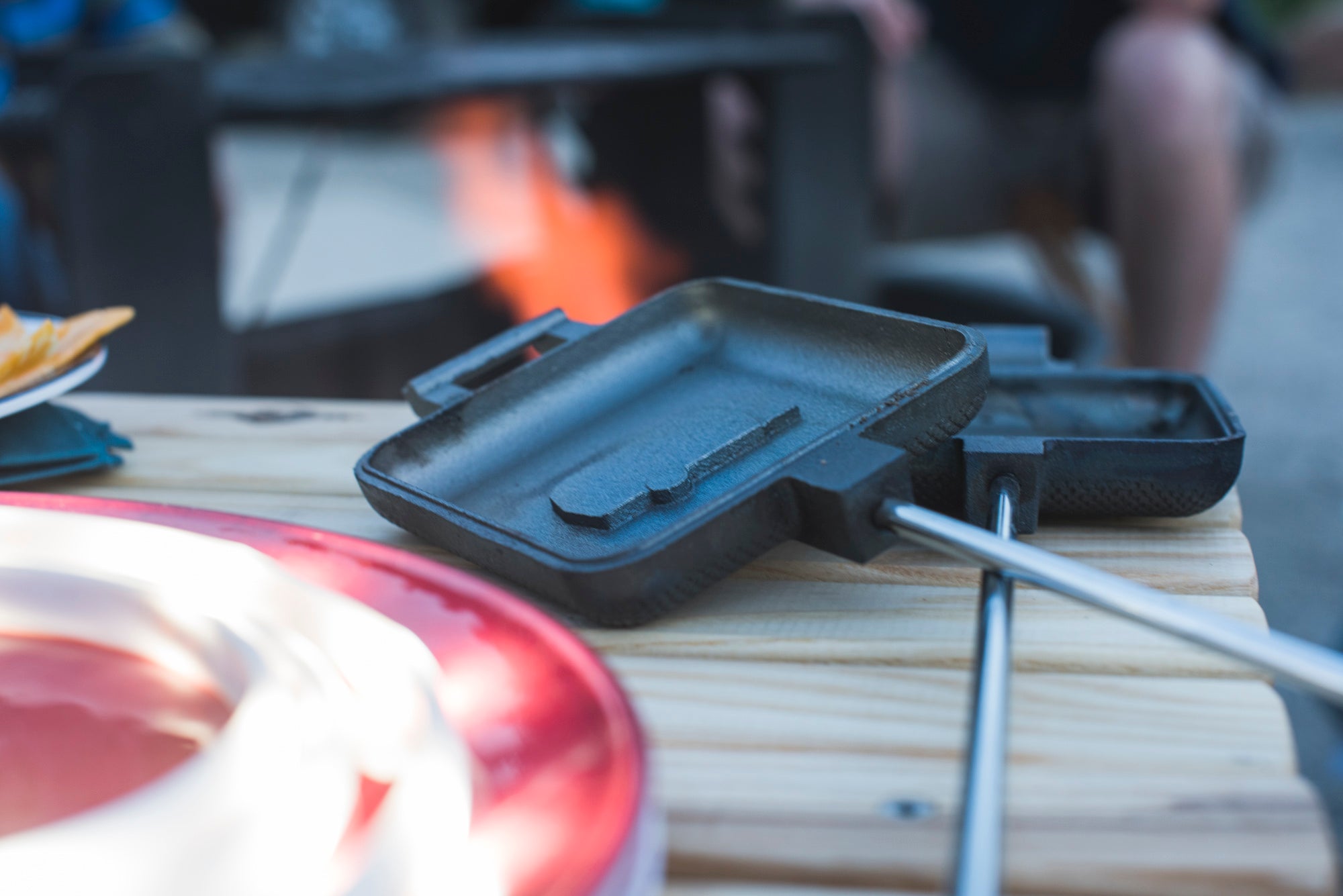 For many, the ritual of making camp pies in a pie iron is as much a part of the campfire as making s'mores and roasting hot dogs. A cast iron clamshell squeezes together two pieces of buttered bread around your choice of filling: jams, cheese, meat – or anything that makes your mouth water. Long handles allow the pie iron to be held over the campfire, and after just a few minutes you can pop it open for a delicious grilled sandwich treat.